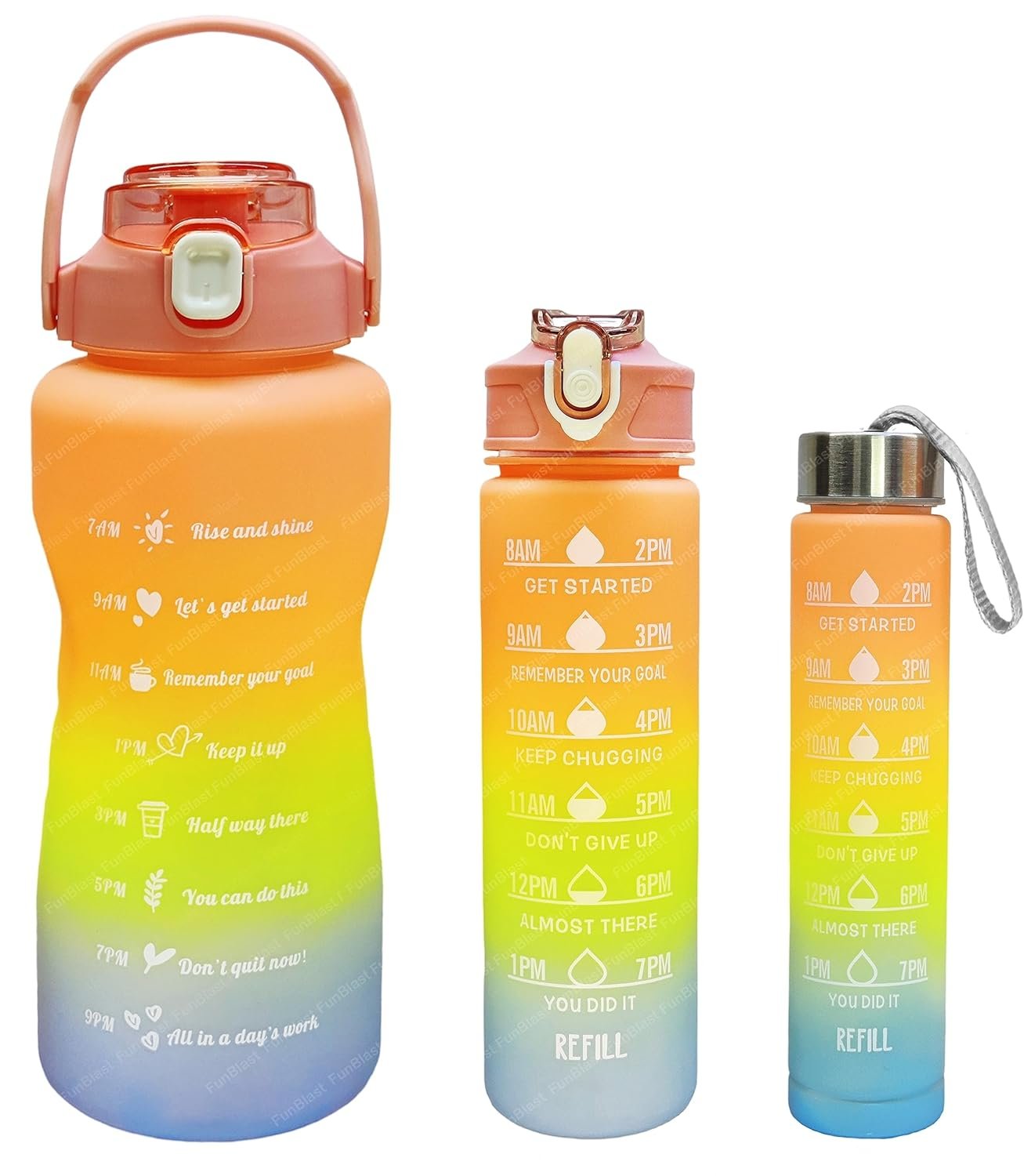 Each bottle features time markers and motivational quotes that remind you to drink water throughout the day. The attractive gradient colors, durable build, and leakproof design make it a perfect hydration partner for gym, yoga, travel, office, cycling, running, and home use.